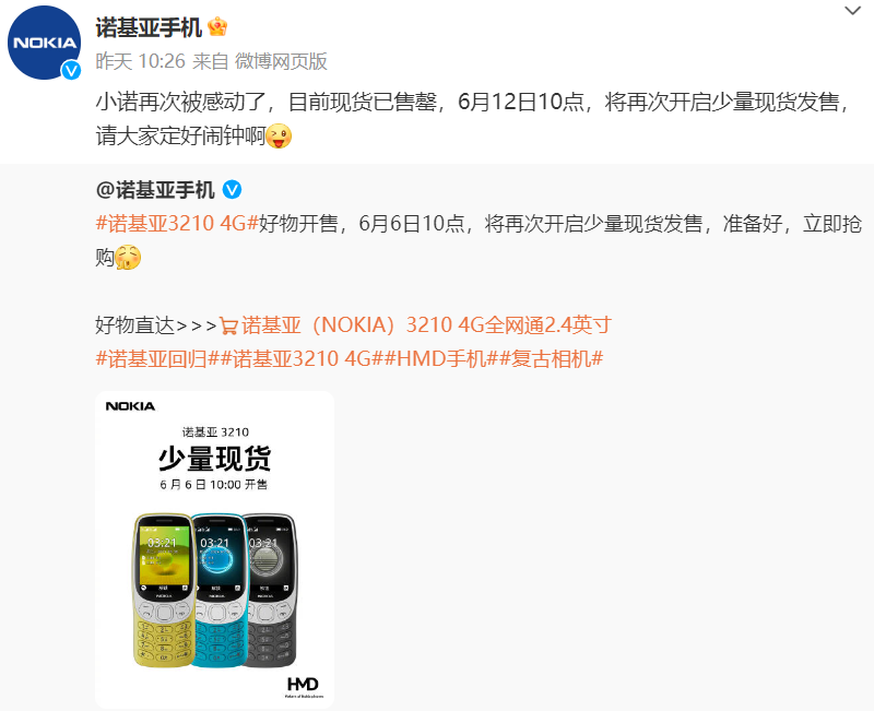 从5月回归市场以来,诺基亚3210的销售就出现了多次售罄的现象,或是从众心理的驱使,让不少消费者跑到诺基亚的官方微博进行催售,火爆程度可见一斑。