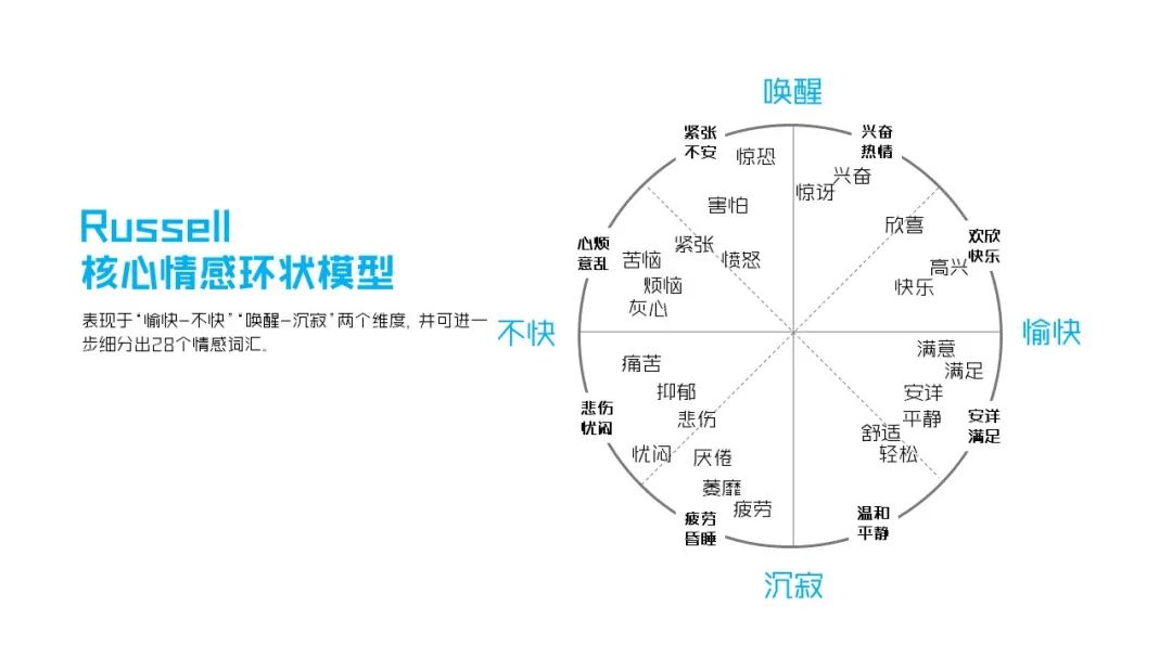 其实人类最基本的情绪有6种:快乐、惊奇、痛苦、厌恶、恐惧、愤怒。此外,在1980年美国心理学家詹姆斯·罗素(Russell)提出了著名的核心情感环状模型。他通过“愉快-不快”“唤醒-沉寂”两个维度去细分人类情绪,划分出了4象限共28种情绪。