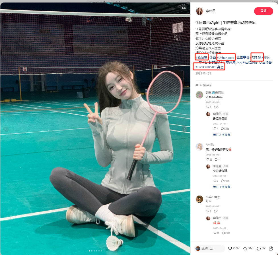 例如:对运动服饰类、鞋类品牌有着“打羽毛球时应该穿什么?”消费需求场景的泛用户,我们可以通过“瑜伽服”、“羽毛球”、等关键词,将品牌产品结合需求场景来种草给用户,再通过聚光拓展出“春日穿搭”、“运动穿搭”这些上游关键词来卡位搜索,成功截留住对穿搭中的瑜伽服感兴趣的用户,注入“BYYOURSIDE身边”的品牌词,直接引入这部分用户的流量,为品牌进行一个种草引流
