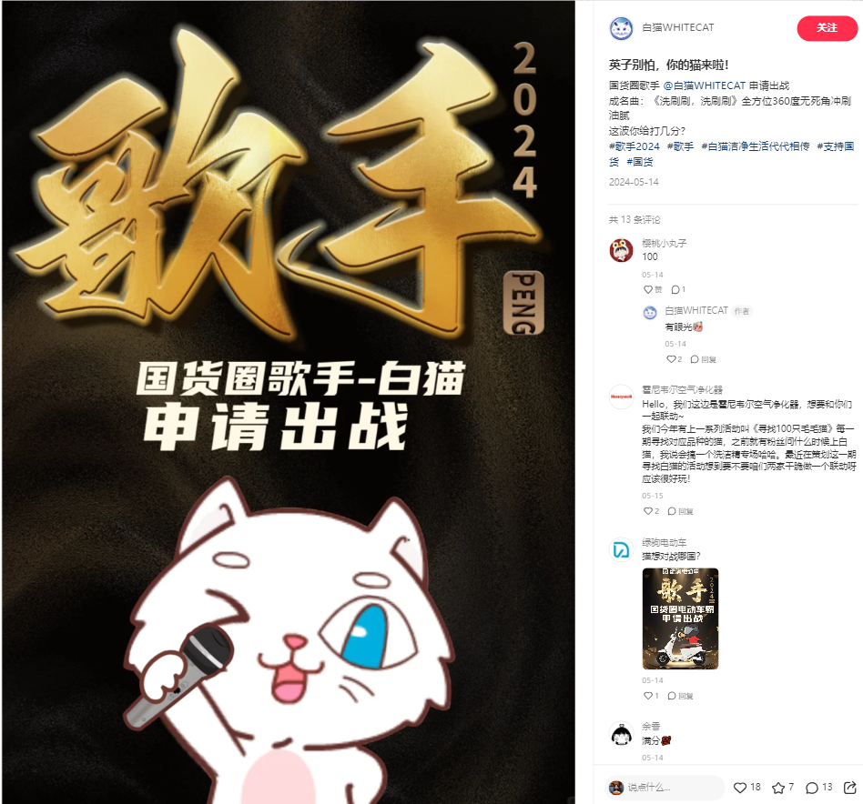 除此之外,白猫紧跟小红书站内热点“歌手出战”展开搞怪营销,这样会营销搞怪的“白猫”因此也吸引了不少想要学习的品牌争先请求联动