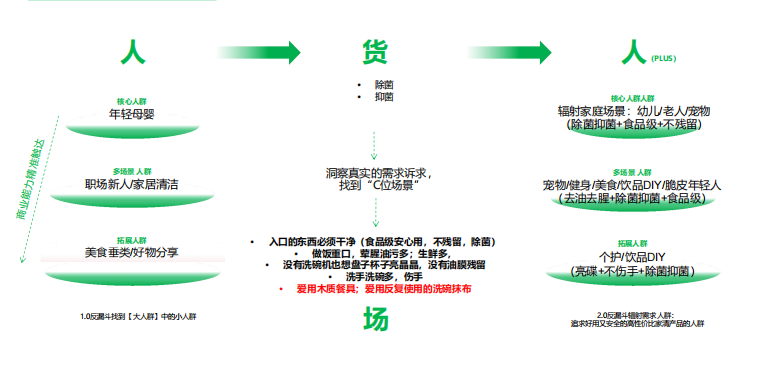 基于此洞察,我们帮助合作品牌金鱼洗涤灵,在小红书进行品牌换新的投放,我们通过拓宽消费人群,扩大使用场并结合热门话题开始。在进行产品定向数据的相关分析后,围绕着洗洁精产品性质,结合“除菌抑菌、一瓶多用”的产品卖点,我们进行了3层人群的渗透。成功在抓取核心人群的同时做到辐射泛基础人群