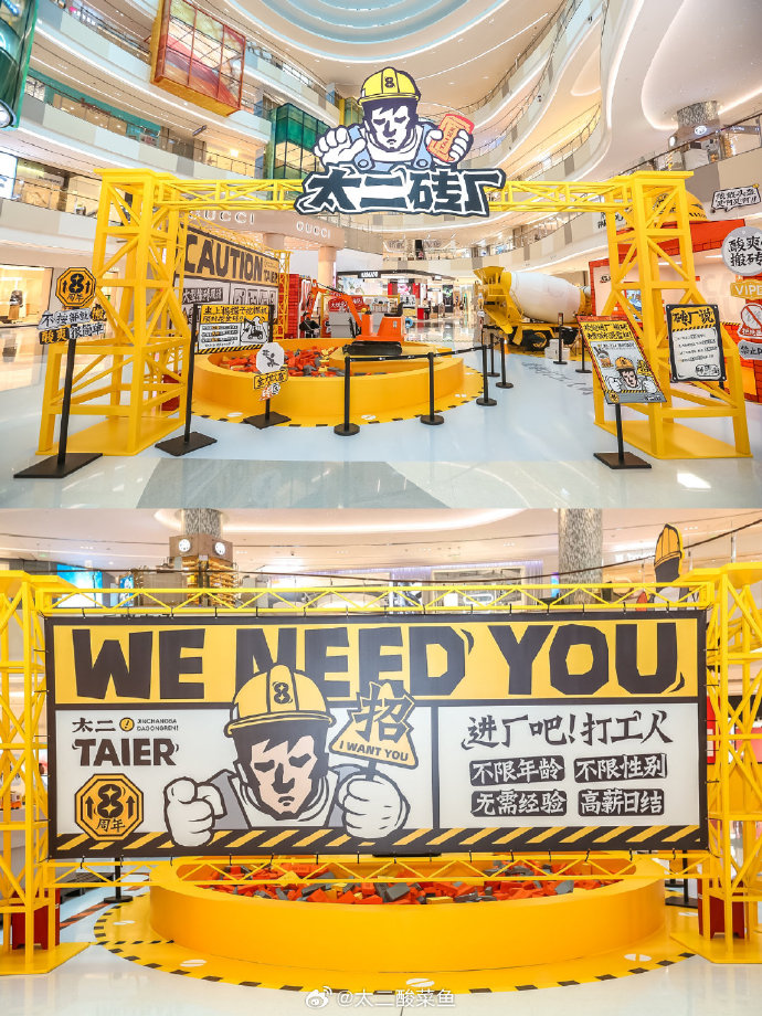 而在工作节奏越来越快的2023年,太二酸菜鱼为打工人造了一间“太二砖厂”。在这个砖厂里,到处都能看到“下班勿扰”“我睡了哦”等共鸣感极强的文案,除了在文案上的共情,太二也用多个互动打卡区传递了一个态度“年轻人不必按部就班地搬砖,只要用自己喜欢的方式,搬砖就会变得酸爽简单。”
