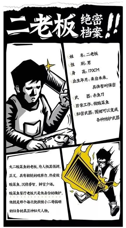 “二”的第二层理解是中二。即便是在二次元的场域中,太二也有点主角气质在身上的:为人低调、观察力敏锐的二老板,其实是一个神秘的大人物,总是能挽救小二哥搞砸的任务。而乐观又自大的小二哥,虽然有的时候不靠谱,但有坏人作恶时,就会化身超级卖鱼侠,立志拯救世界。而在他们的故事背景中,小二哥的武器“菊花瓣飞镖”,正是老坛子酸菜鱼的点睛之笔,而二老板的专注和固执,更能让消费者感知到品牌对品质的保障。