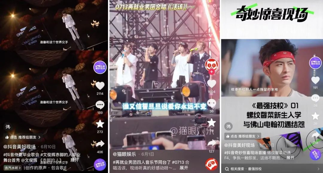 「深响」观察到一些新的尝试。例如,在线上,除了常规的技术支持,「抖音美好现场」将小屏直通大屏0时差互动、留言板、烟花等平台交互玩法融到线上观演中,带动观演体验相关的衍生话题发酵,例如抖音仲夏毕业歌会和美好星球音乐节催生了#想回到毕业的那个夏天(累计播放量2.1亿次)、#当显眼痛包混入音乐节(累计播放量728.3万次)等话题。演出能量由此扩散到了情感、消费领域,热点持续发酵。