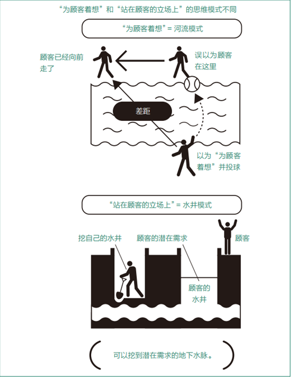 铃木敏文认为,可以把“为顾客着想”的思维模式和“站在顾客的立场上”思考的思维模式分别比作“河流模式”和“水井模式”。