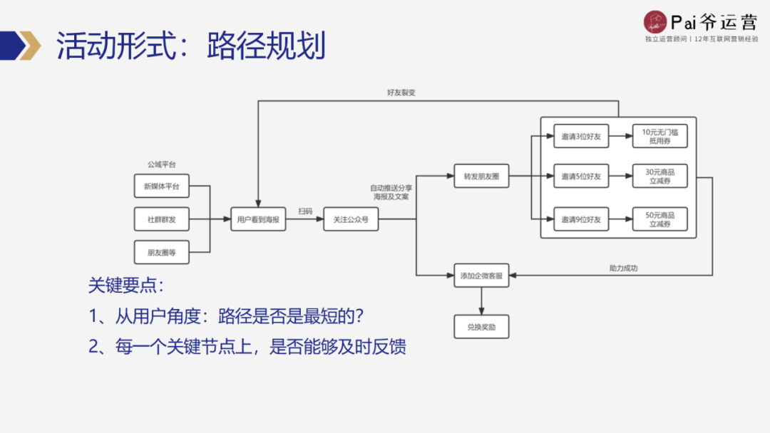 那除了这两个关键点之外呢,在设计用户路径的时候,不同的活动目的,它的路径长短是不一致的。比如核心目的就是涨粉,只要把用户沉淀到私域流量池里就可以了。所以它的路径到用户兑换奖品这一步其实就已经完成了。那如果说你的活动目标是提升转化。那么在后端设计的时候,就可能需要在用户兑换奖品的时候,再增加一个关联性销售的一个推荐,去引导用户加购其他商品。那如果是既要涨粉、又要转化,完了还要能裂变。那就可能需要把两个路径进行一个结合。比如说先让用户沉淀到公众号里,然后再引流到企微号上,公众号这边可以直接去做裂变,然后最后等用户领取奖品的时候,再用企微号去做一个转化好,所以根据活动目的的不同,路径设计需要根据实际情况进行一个调整的。