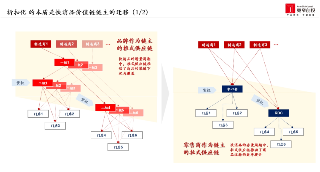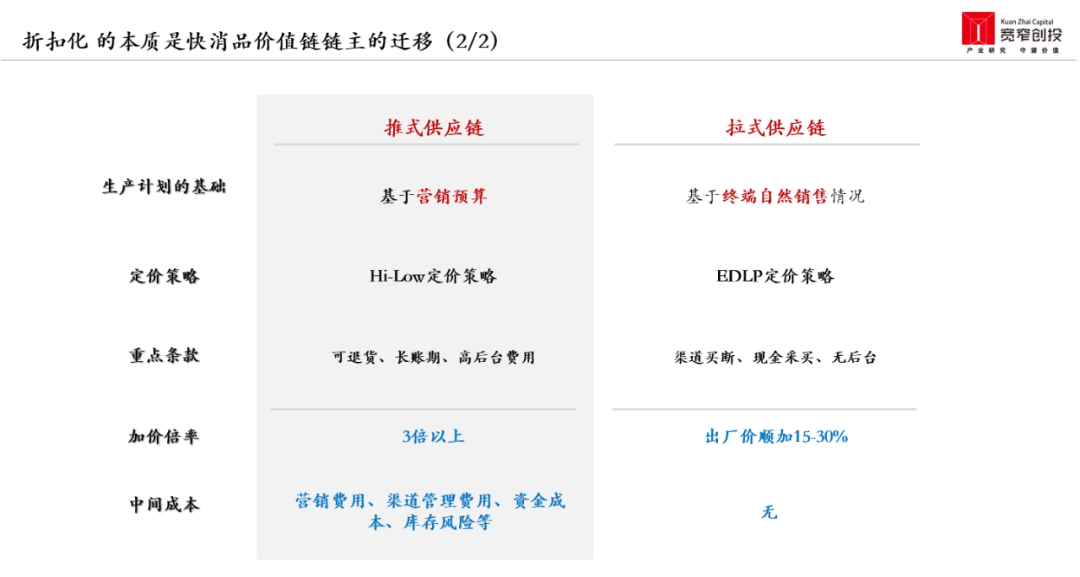 在胡春龙看来,“折扣化”本质是快消品价值链链主的迁移。市场正从此前以品牌做为链主的推式供应链转向以零售商为主的拉式供应链,零售商真正开始负责货权。