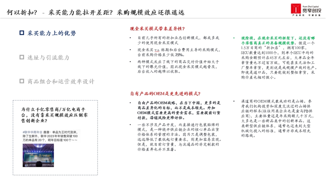 第一,目前折扣型零售商的采买能力相对传统零售商其实没有多大优势,很多标榜自己是折扣零售的还是弄了45天左右的账期,但值得注意的是这些创新业态或多或少地使用现金采买模式。