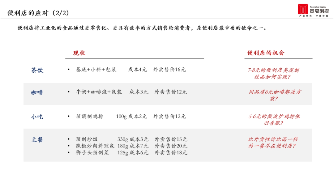 我们觉得,对抗折扣化最重要的一点是强化在零售快餐型产品的投入,就是围绕主餐、下午茶、夜宵等多功能场景做深度开发。这个机会点的出现要感谢外卖,可以说外卖的出现已经让便利店的成长落后了一个周期,但这也是现在外卖生态中留下的一些发展空间。