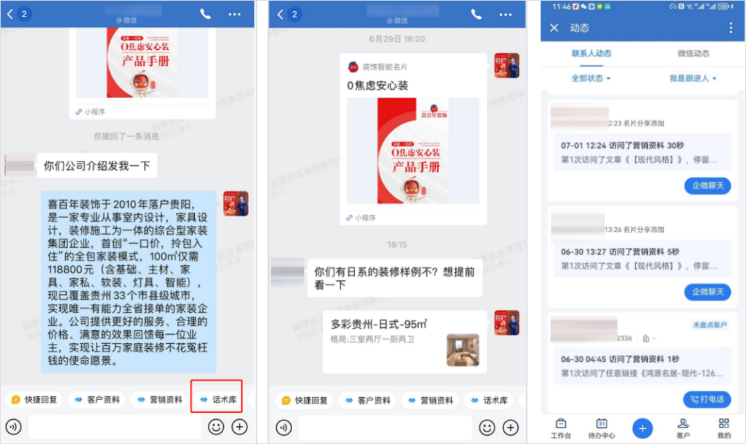 装修是一个信息量大、专业度较高的领域,有时单个客户沟通时间长达数月甚至一年之久,因此在私域转化方面,喜百年采取了超精细化的运营方式,通过营销素材库的灵活应用和全流程数据能力为用户提供个性化服务。
