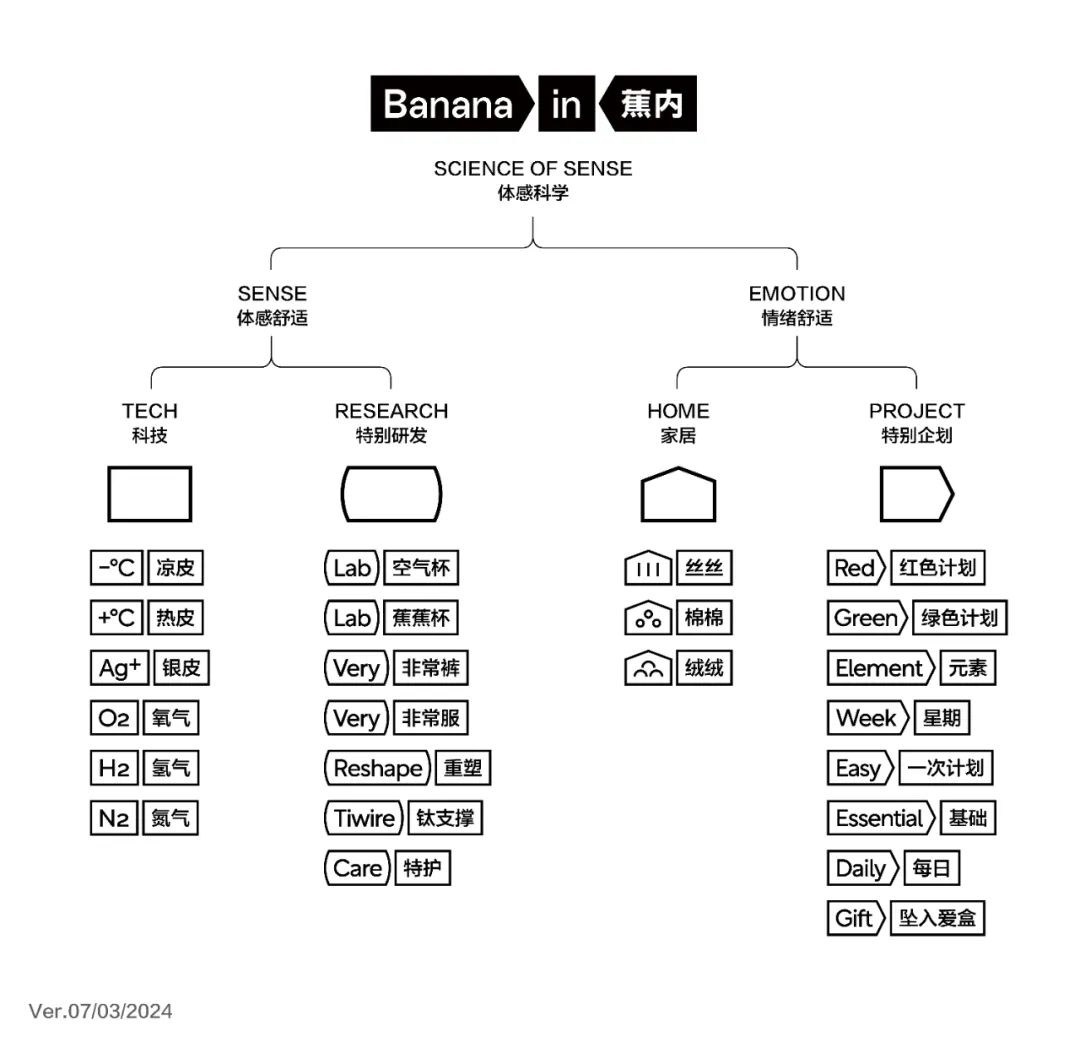 特别是2024年7月23日,蕉内迎来了VI 3.0的正式上线,现在蕉内的产品不仅是形态上的无标签化,还以体感科学为研发理念,全方面指导品牌全品类产品的研发和设计逻辑。