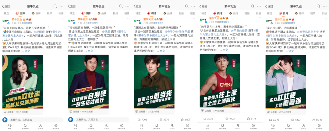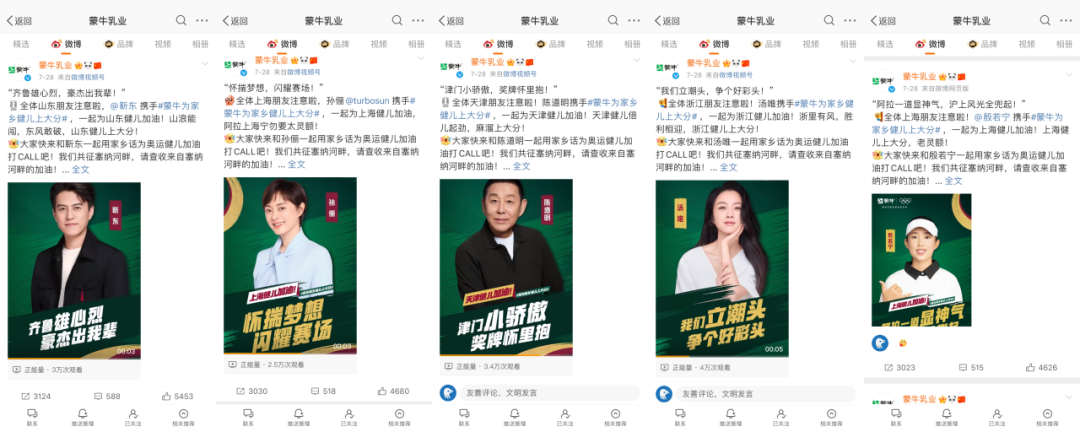 所以在线下快闪之外,蒙牛还有一个线上大动作,携手集团26位代言人,用家乡话为家乡奥运健儿加油。