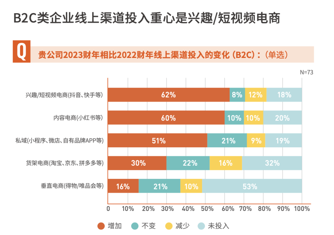 调研报告说,2023 财年,B2C 类企业花了更多的钱在兴趣/短视频电商、内容电商和私域上。2024 财年,有 60% 的企业将增加产品/服务的研发费用;28% 的企业减少公关费用;26% 的企业减少广告费用;22% 的企业减少营销团队费用。