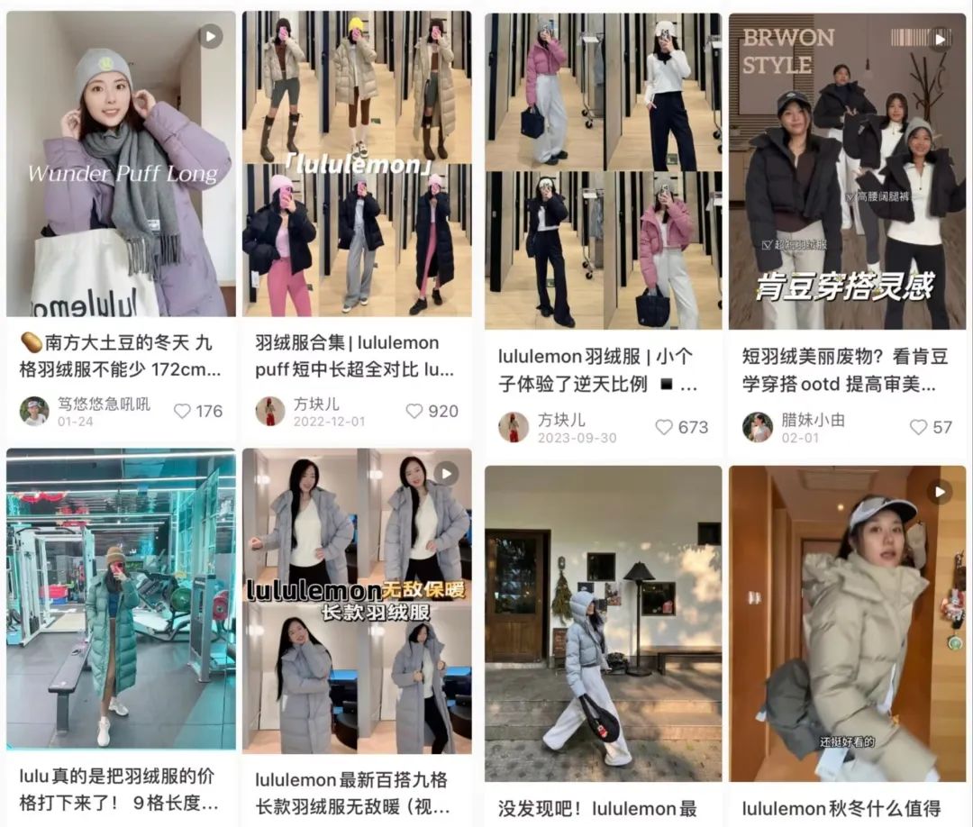 去年冬天,lululemon 就是这么把三格羽绒服卖爆的。为了研究消费者的购买动机,lululemon 先看了一下消费者都在小红书搜什么。结果发现小红书用户搜关键词的时候,会具体到“lululemon 羽绒服三格”、“lululemon 羽绒服九格”这么细的颗粒度。