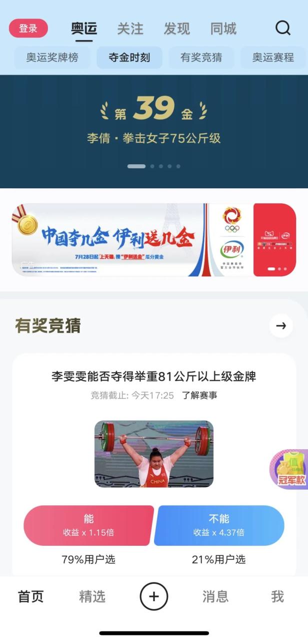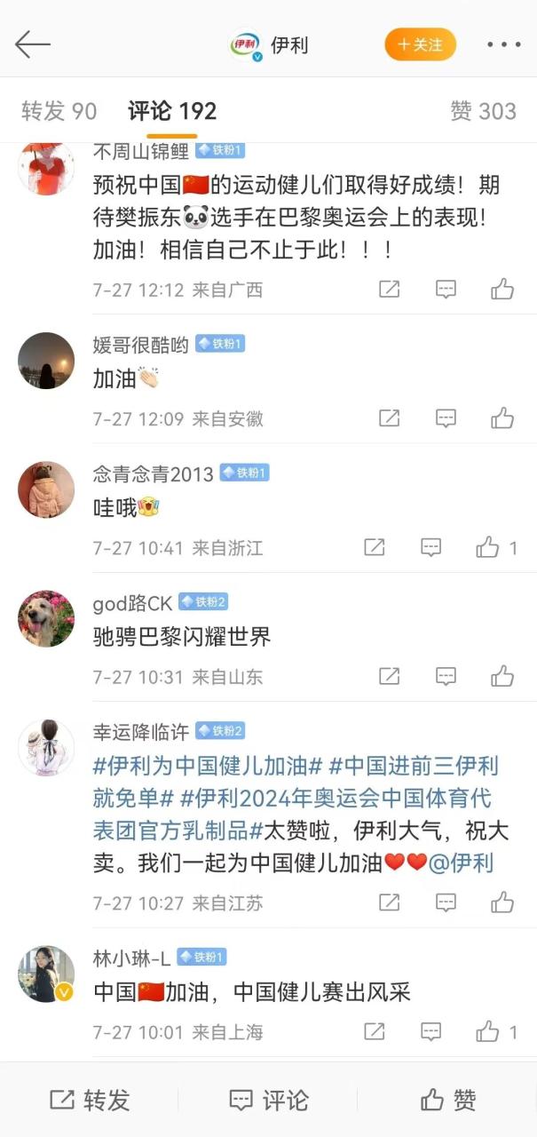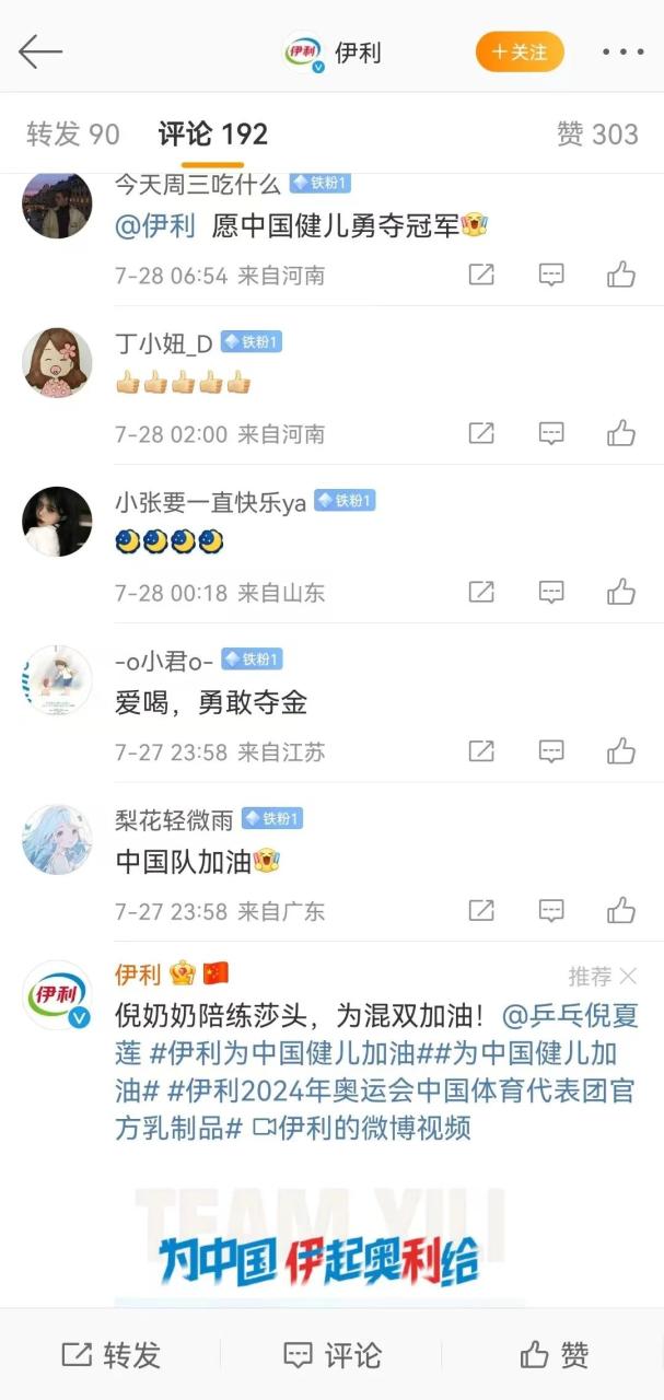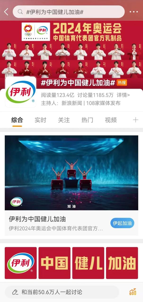伊利品牌刷屏各大社交平台,热门话题火速登上热搜。在传播主阵地微博平台,10+个热搜霸榜,引爆网友关注,其中#伊利为中国健儿加油#已经超百亿阅读,互动讨论量总和超过1185.5w;#中国夺几金伊利送几金#6571.7w阅读,1w讨论;#中国进前三伊利就免单#8142.2w阅读,25.6w讨论。