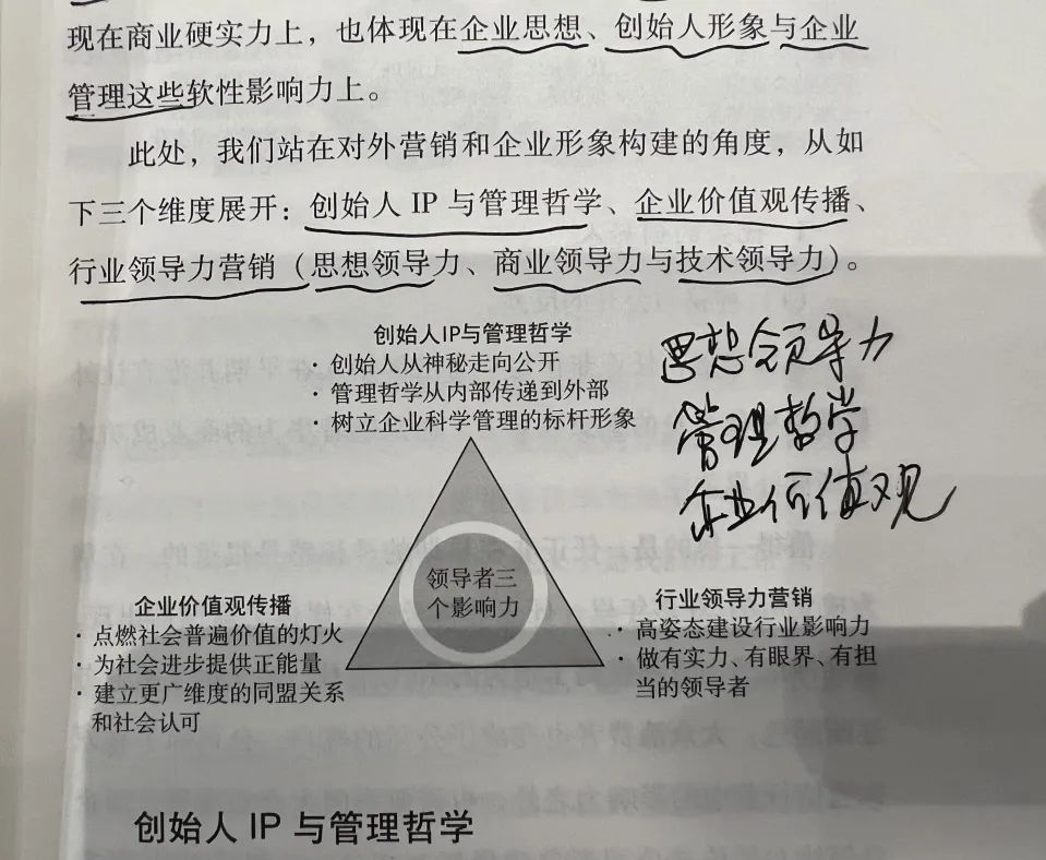 但华为的创始人IP靠的不是向外输出短视频,而是深厚的企业文化和管理哲学(当然还有任正非个人的人格魅力)。而且书中还进一步指出,领导者需要具备三个影响力:思想领导力、商业领导力与技术领导力,企业需要开展领导力营销。