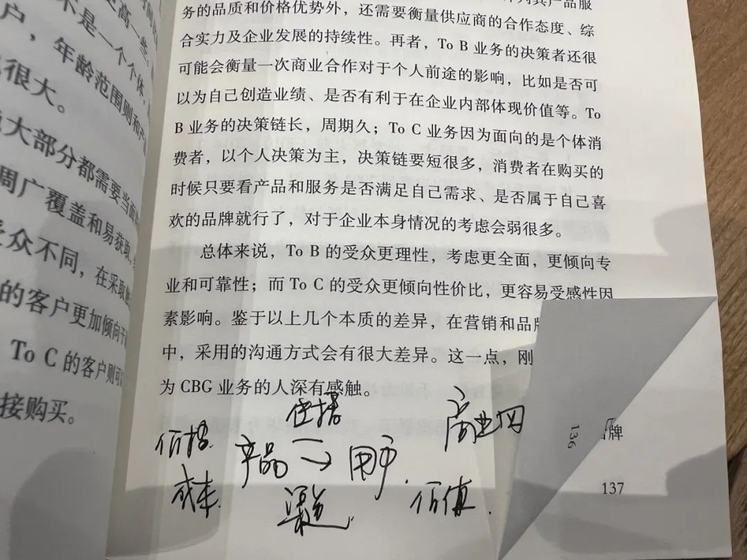这类观点和洞见,在书中其实非常多。我在阅读这本书过程中,做了大量笔记和折页。而且这本书带给我的很多启发,我都打算在修改品牌30讲时更新进去。拍几张给大家看一下。
