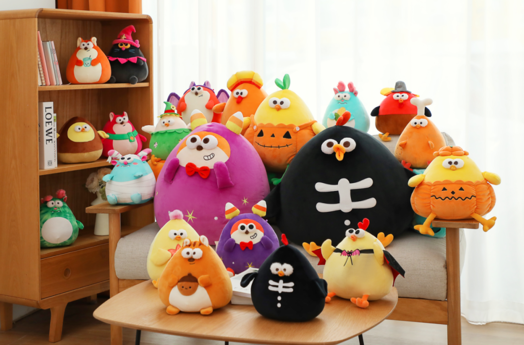 后续名创优品对DUNDUN鸡的运营也不可谓不上心。衍生出了爸爸、妈妈、宠物柯鸡等家庭角色,还有美食系列、蔬菜系列等多种多样的形象。
