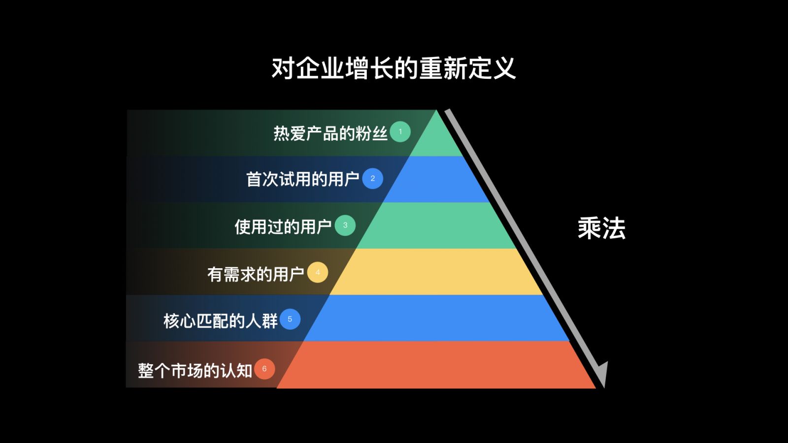 看着到这里你有没有发现,这种新型的增长思维是对传统营销思维的颠覆性认知。传统营销是以流量为起点不断做除法,是一种漏斗型的思维。而新型增长模型则是从核心价值出发不断做乘法,它从一个核心价值点开始培养忠诚的用户群,再根据用户画像进行培育和传播,最后一步,才做全面的市场品牌认知。