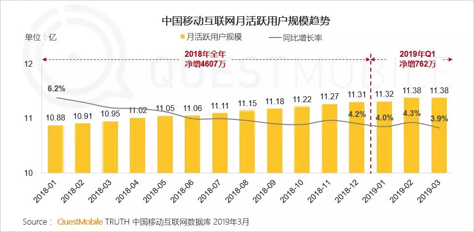 根据QuestMobile发布的《2019年Q1移动互联网生态流量洞察报告》显示,中国移动互联网月活跃用户规模达到11.38亿,同比用户增速首次跌破4%。