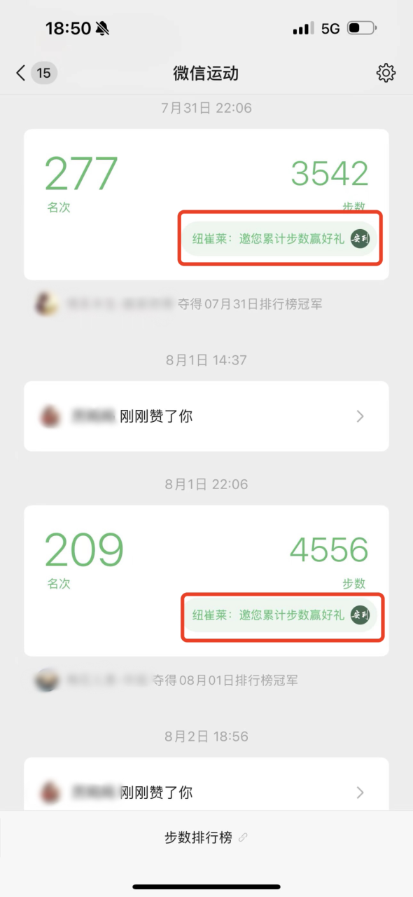 首页入口全量推送:打开微信运动,即可一眼看到步数成绩下面增加了一圈高光banner,安利纽崔莱品牌logo及活动信息醒目亮相,提醒用户参与赢取奖励。