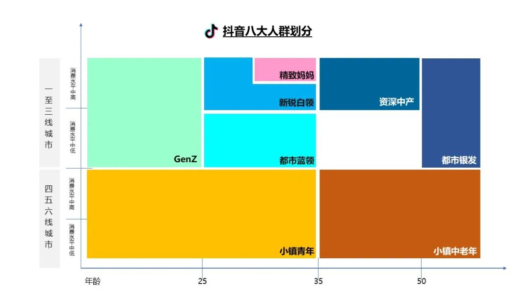 比如我们常说抖音有8大人群:GenZ、新锐白领、都市蓝领、精致妈妈、资深中产、都市银发、小镇青年和小镇中老年。