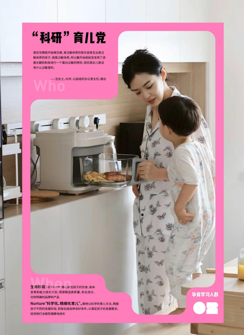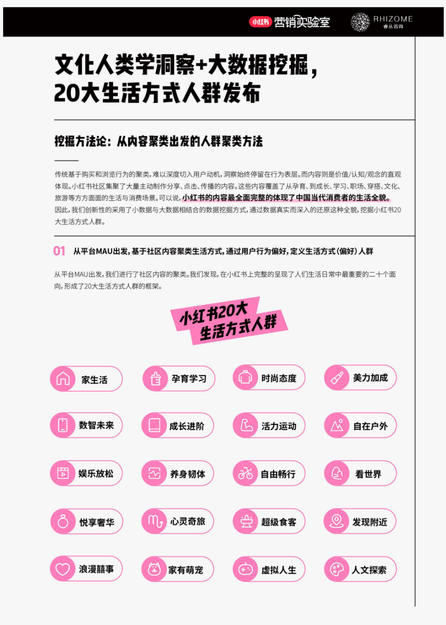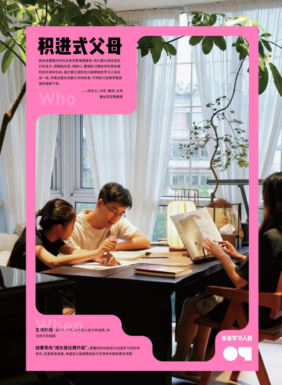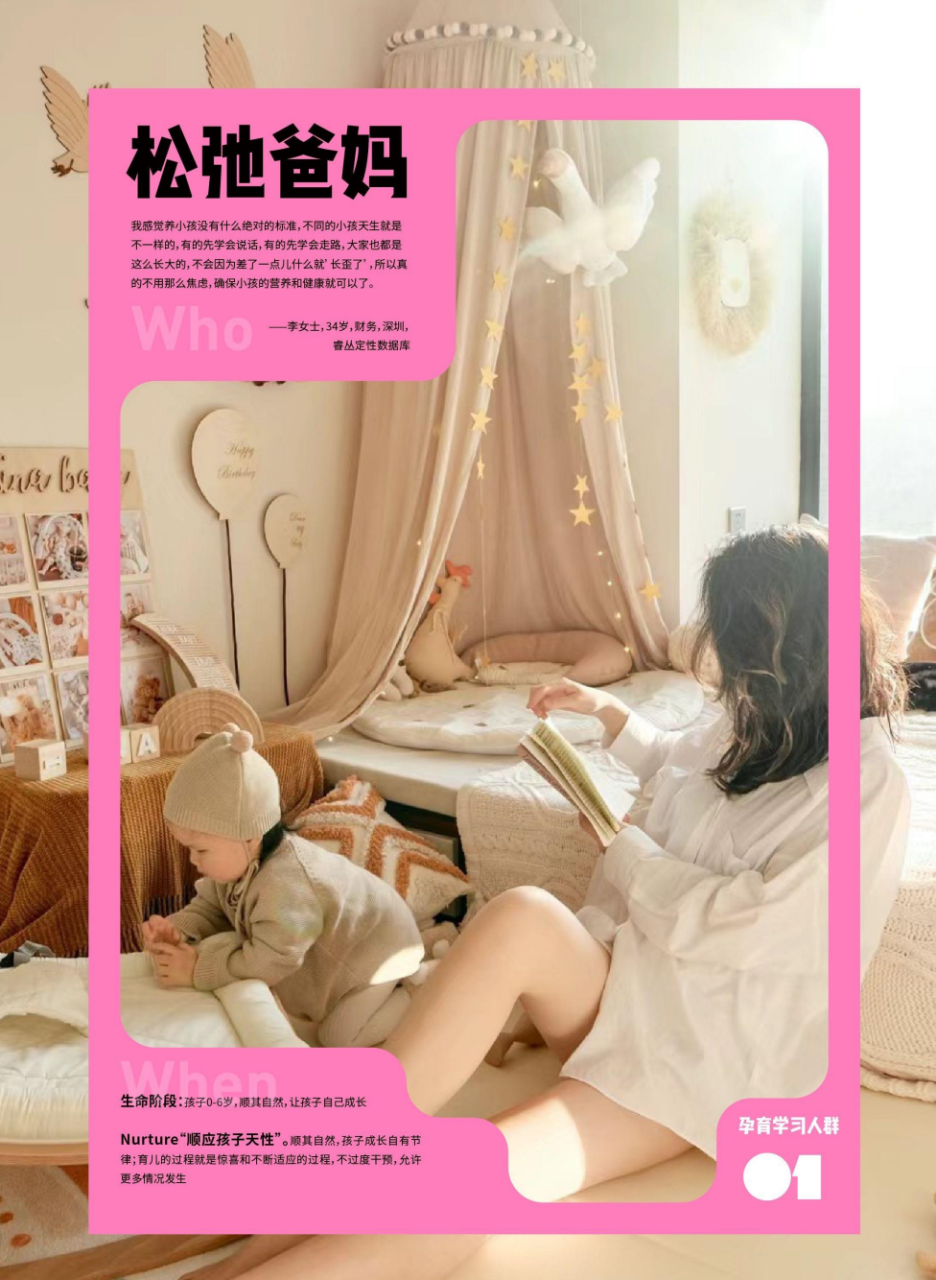 再如今年4月份小红书发布“20大生活方式人群白皮书”,按照家生活、孕育学习、时尚态度等生活方式细分出来20个人群,像孕育学习人群就进一步分成松弛爸妈、科研育儿党、友伴式父母、积进式父母等4类人。