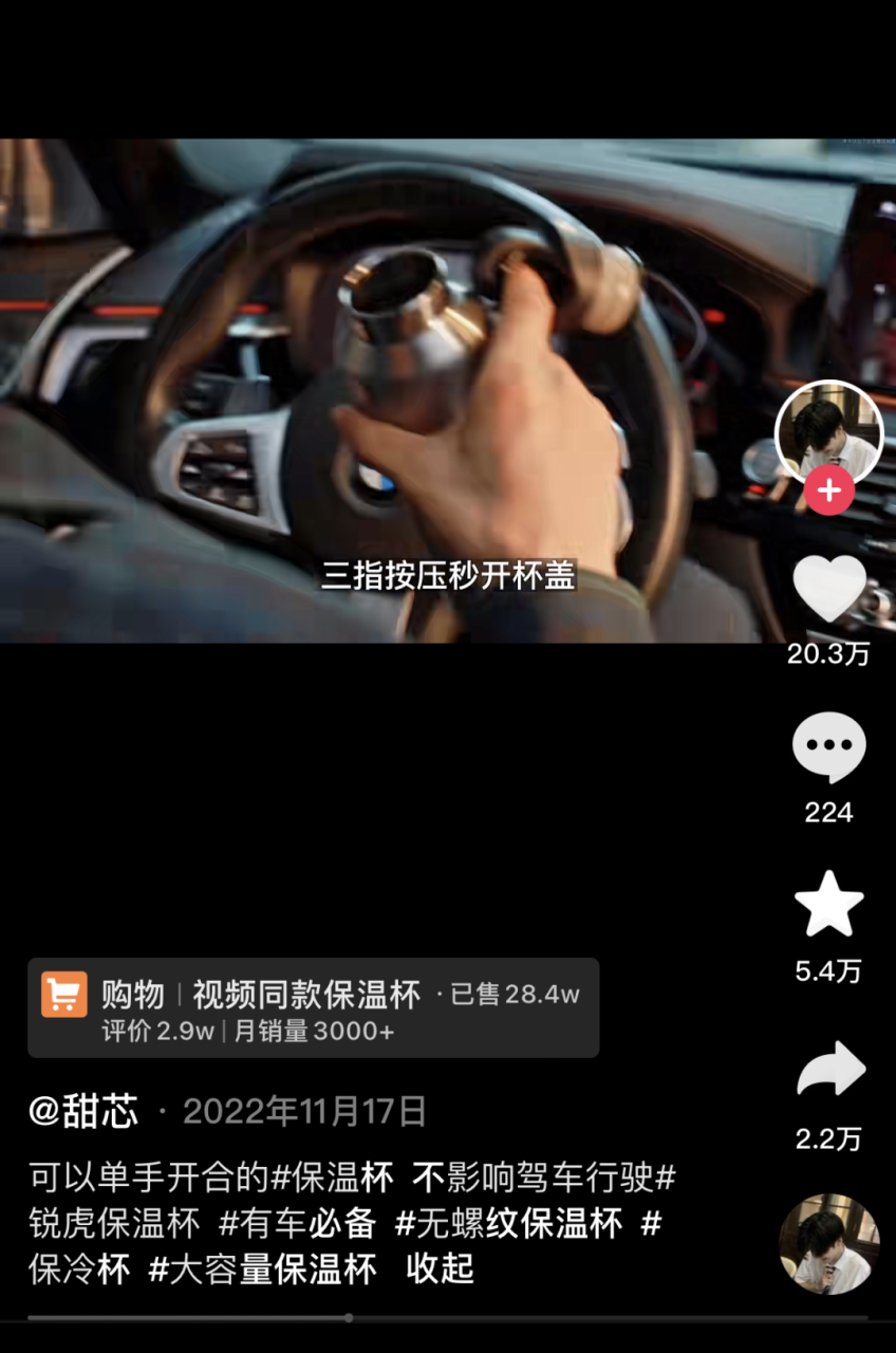 还有我最近知道的一个案例,锐虎保温杯。它的最大卖点是无螺纹设计,杯盖可单手开合,不需要双手拧开,对于开车的人来说就特别友好且安全。