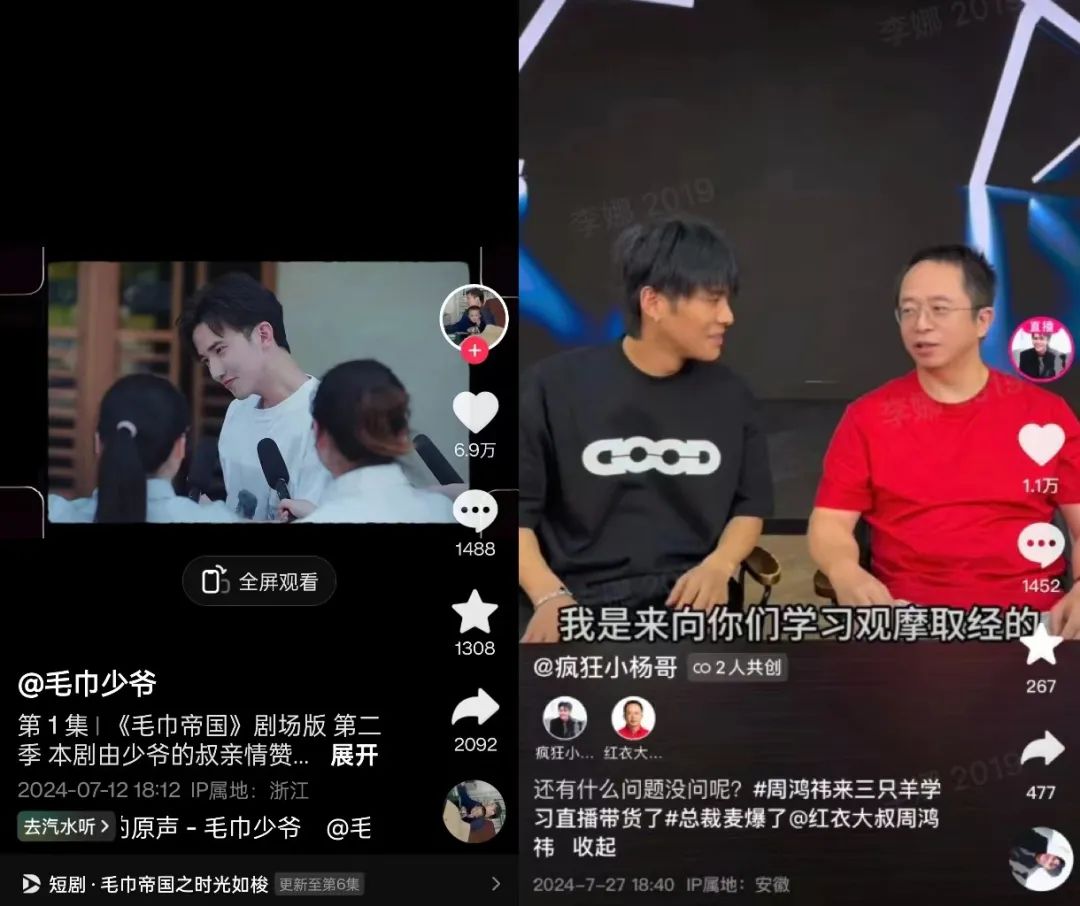 当然,品牌总裁出镜目的往往不是单一的。鸿星尔克在今年品牌升级,吴荣照和小杨哥合作直播,既提升了品牌形象,也实现了新品销量的突破;再比如洁丽雅,凭《毛巾帝国》短剧刷新品牌形象后,迅速策划开启直播,直播首秀吸引 150 万人观看,登顶抖音电商带货总榜 TOP1,实现了品效合一。