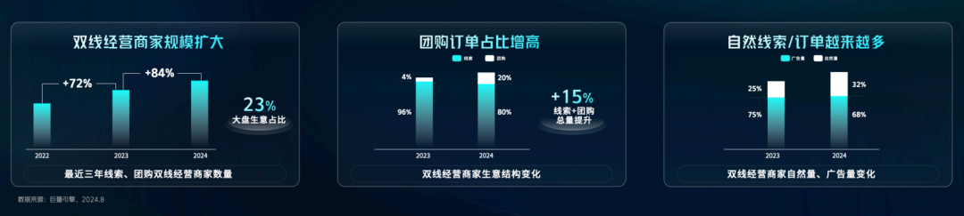 根据巨量引擎提供的数据,2024年上半年在抖音同时做团购与线索营销的商家数量同比去年增长了84%;同时这部分双线经营的商家,自然流量占比也从2023年的25%,提升到了2024年的32%,这让他们的利润空间更大,生意越做越健康。