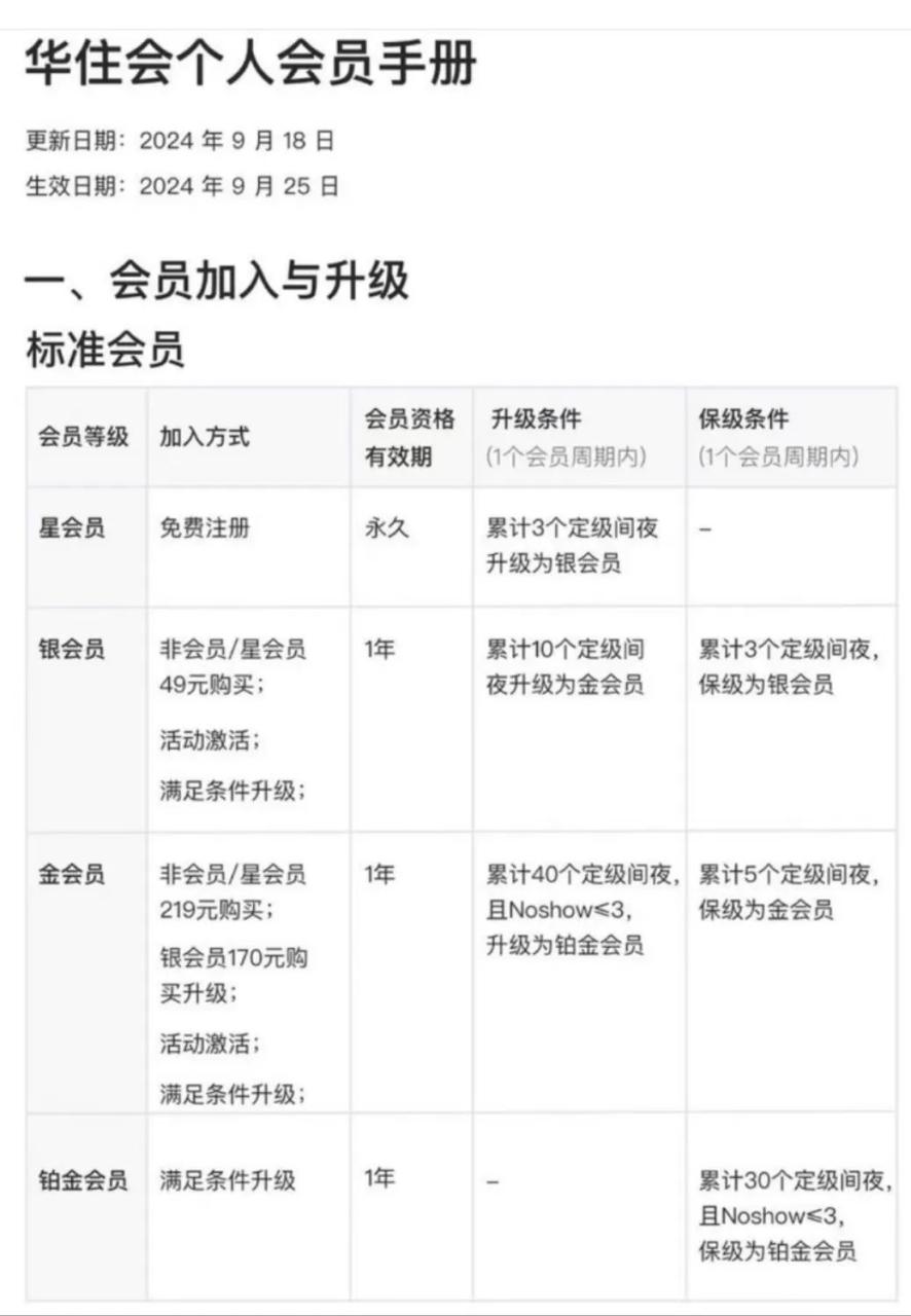 华住会员是进行分级管理的,一共有四种等级会员,分别有:星会员(免费注册)、银会员(49元购买)、金会员(219元购买)、铂金会员(需满足条件升级)。会员级别越高,享受的权益越多,最高级的铂金会员可解锁最高折扣和所有权益。