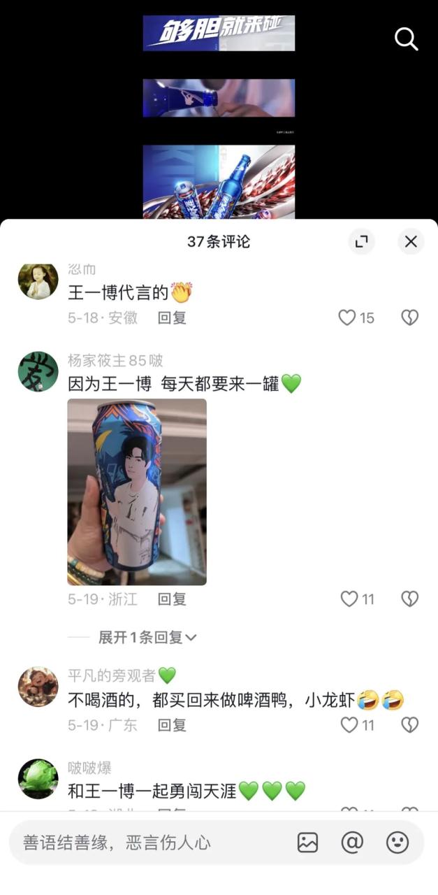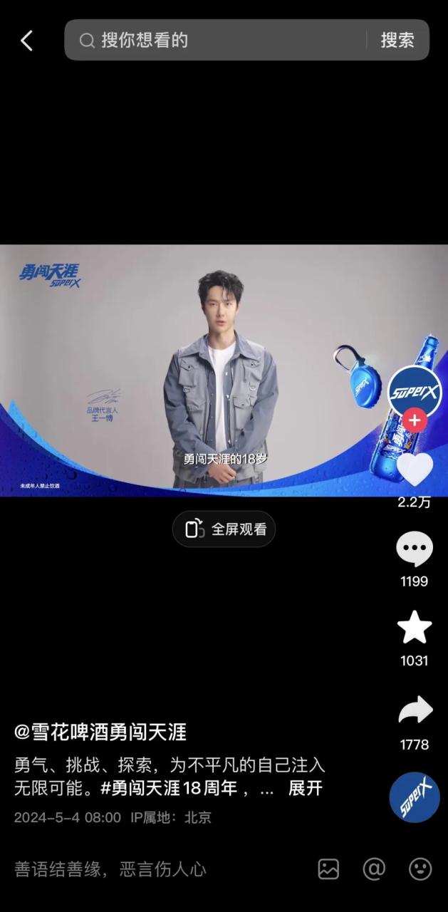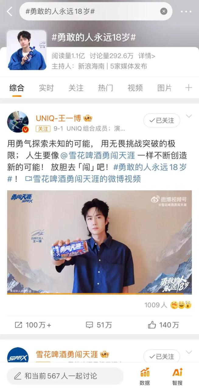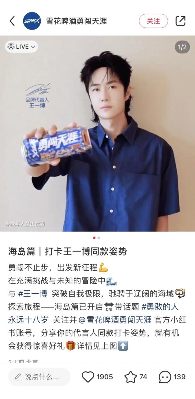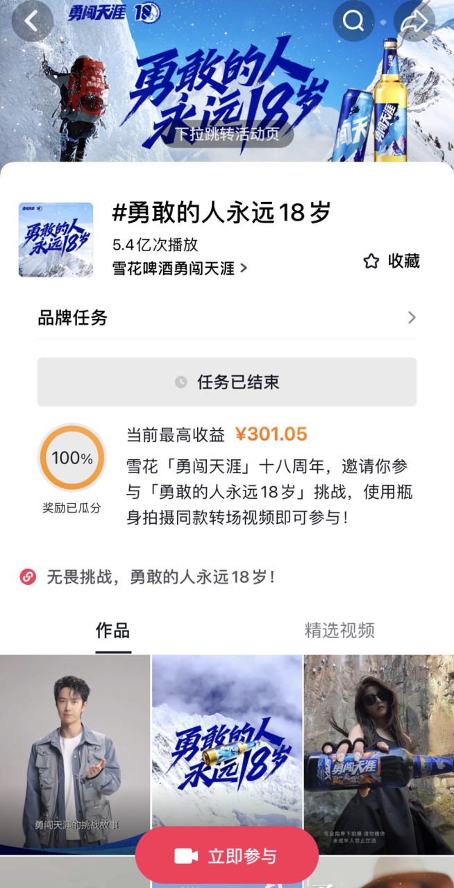 比如在五四青年节期间,品牌以代言人王一博发布勇敢挑战“征集令”为契机,通过话题页+全民任务+挑战卡片+优质达人+大众KOC+打卡裂变+销售联动等全域立体化传播链路,在借助打卡热势的同时,最大化地进行品牌曝光露出,很多粉丝也开始积极拍摄UGC为品牌“代言”,相当于一场“明星营销”和“事件营销”的联动。
