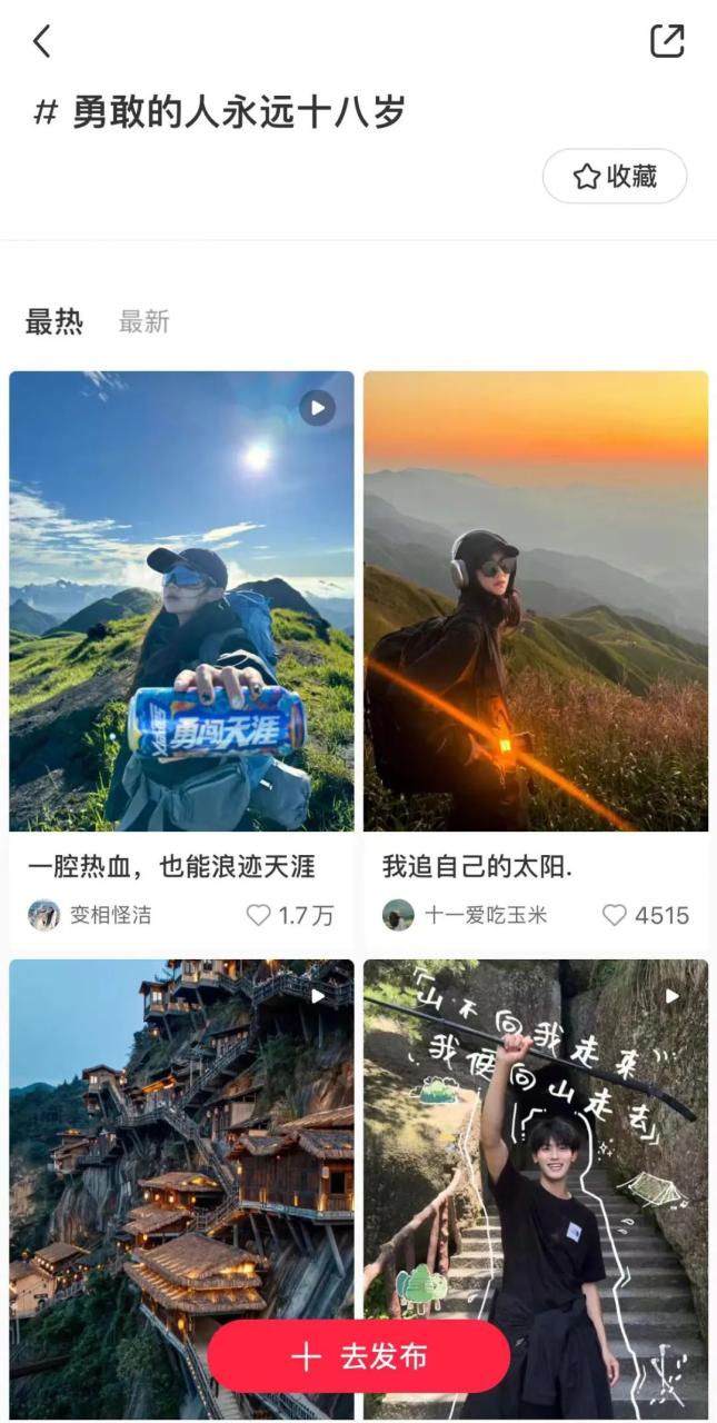 所以在“话题种草”的同时,勇闯天涯也在不断向“情感种草”靠拢,希望在#爬山要这样才够酷#、#保持热爱奔赴山海#、#登山照怎么拍#的热点,以及“勇敢的人先享受世界”“人生是旷野 不是轨道”的热梗中,看到勇闯天涯背后的情绪价值,吸引更多的泛用户,也建立了更多人对于这种豁达人生观与勇闯天涯的自然联想。而打卡仪式也在这样的氛围中得到升华,让更多人建立了“打卡不只是仪式,而是对自己勇敢时刻的见证”的心智共识,形成与品牌的情感共振。