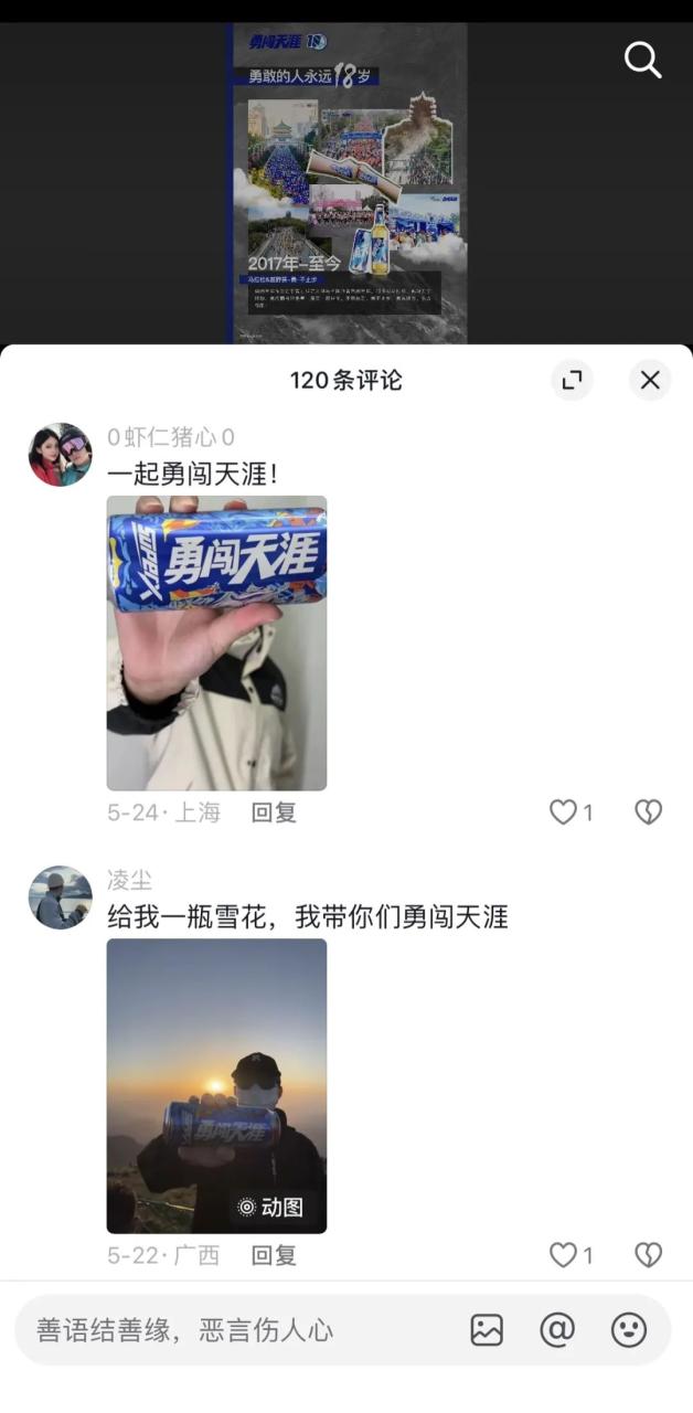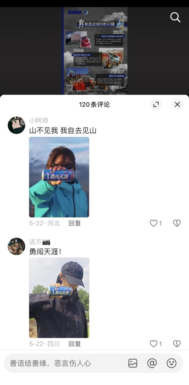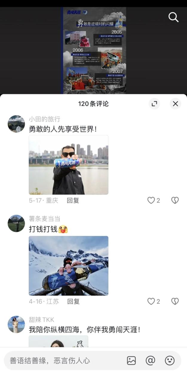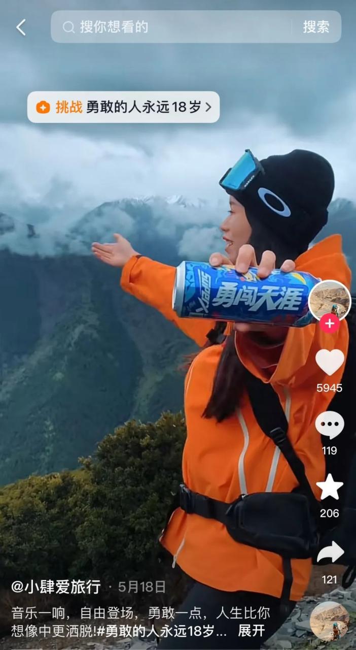 今年3月,户外圈悄然兴起了一小股“勇闯天涯”打卡的风潮。从广袤无垠的草原,到白雪皑皑的雪山,越来越多的年轻人开始举起手中的易拉罐,用最直观的方式告诉大家,自己正在“勇闯天涯”。而勇闯天涯也闻风而动,用一个名为#勇敢的人永远18岁#的话题接住了这波热度。后来我们了解到,当时恰逢勇闯天涯18周年活动的起点,这个打卡姿势不但契合新时代年轻人的态度和主张,也和品牌精神非常适配。所以品牌方真诚而迅速地反应,从一开始就收获了不少好感。