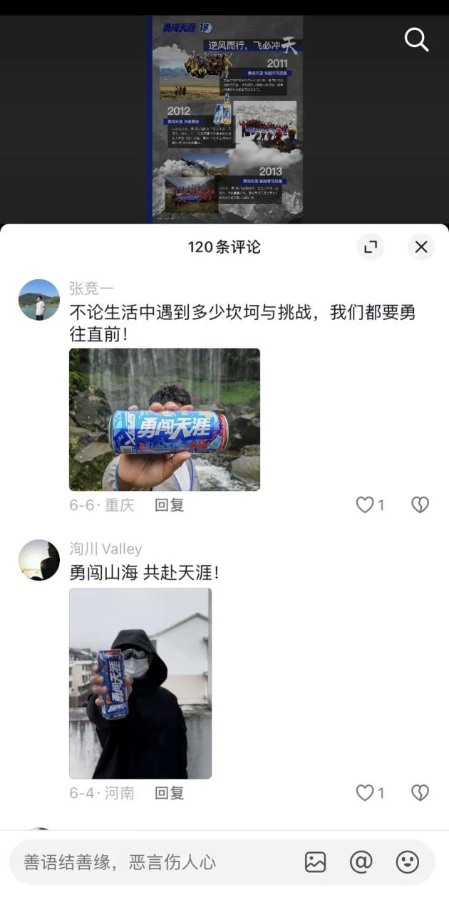 因此,品牌在线上联动访谈号@北京青年x壹次访谈录,邀请2005年勇闯天涯队员、纪录片导演刘畅,2009年勇闯天涯队员、户外运动爱好者向老师,2013年勇闯天涯队员、极限摄影师铁丐讲述勇闯天涯往事,用回忆将共鸣情绪拉满。不仅如此,品牌也在微信公众号发布18周年主题活动#勇敢的人永远18岁 ,引导老用户留言互动“分享18年来你最难忘的勇闯时刻”,调动大家的分享欲。