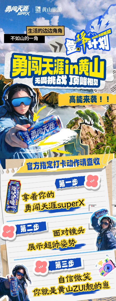为了让用户在任意触点就能实现所想即所得,勇闯天涯直接与安徽黄山、山东泰山、江苏溧阳南山竹海、甘肃敦煌鸣沙山、湖北神农顶、江西武功山等知名景区做了联动,将祖国河山的壮丽景色与品牌的挑战、无畏精神相结合。比如在与黄山的合作中,品牌不仅推出了联名门票套餐,还推出了打卡地图和打卡攻略,用一站式的保姆级攻略,帮助更多年轻人在攀登高峰以后晒出“勇闯天涯”的自己。