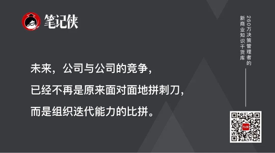对组织来说也是这样,一定要不断成长,要有自己的生命力。今天,公司与公司、组织与组织之间的竞争,已经不再是原来面对面地拼刺刀,而是组织迭代能力的比拼。最后比的不是谁的起点高,而是谁的成长速度快,这是企业竞争的关键。
