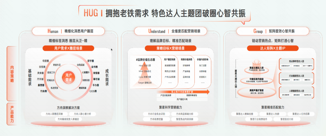 “精准”,则是快手从产品技术层面去帮品牌去精准找达人,以“HUG策略”前期精准洞察用户圈层(Human),全维度找寻和匹配达人(Understand),并最终组成达人矩阵(Group)做立体化种草。