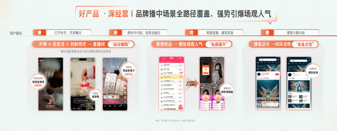 快手给出的思路,是始终跟着用户在站内行动轨迹走——用户打开快手,开屏广告会抓住“第一眼”注意力,缩短品效转化路径(比如晃一下进入直播间或到达活动页);刷视频时,信息流广告、创新互动样式、卡券发放等等可引导用户进入品牌私域留存沉淀,或直达商品页转化;当用户边看边搜时,搜索品专可以做高效收口;在用户看直播时,看播挑战等互动玩法还会增强用户参与兴趣。
