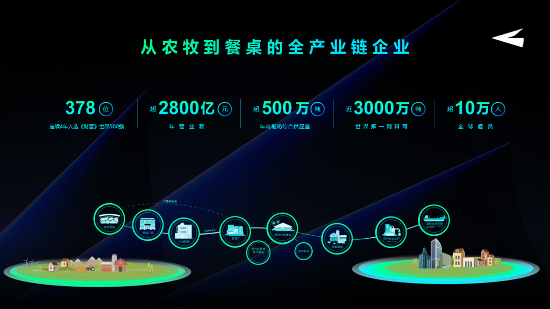 在今年8月公布的《财富》世界500强中排在第378位,2023年的营业额超过2800亿元,每年为市场提供超过500万吨的肉蛋奶、3000万吨左右的饲料,在全球拥有超过10万员工。