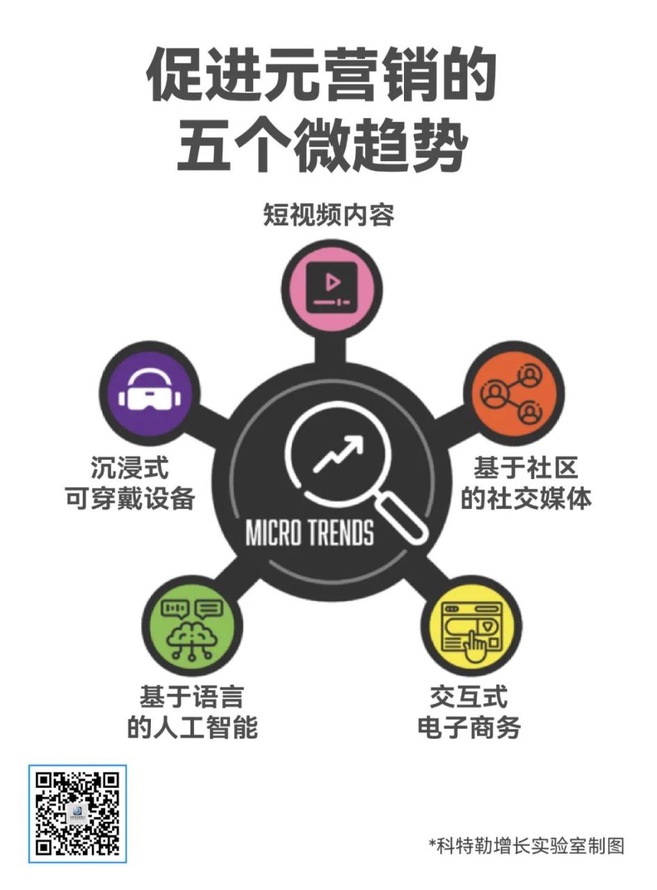 在菲利普·科特勒所畅想的“沉浸式的元营销”时代,营销有5个微趋势,或者说是基本组成部分,包括:短视频内容、基于社区的社交媒体、交互式电商、基于语言的人工智能和沉浸式可穿戴设备。