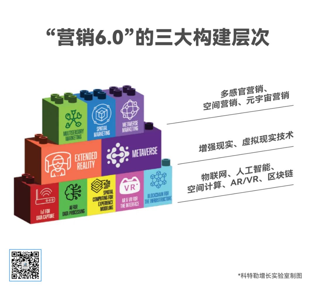 基于元营销的“营销6.0”,包含三大构建层次:最底层是将线上和线下结合起来的五种技术——物联网、人工智能、空间计算、AR/VR和区块链;中层是增强现实和虚拟现实技术;最终的目标则指向最上层的面向顾客的体验,包括多感官的营销、空间营销和元宇宙营销。