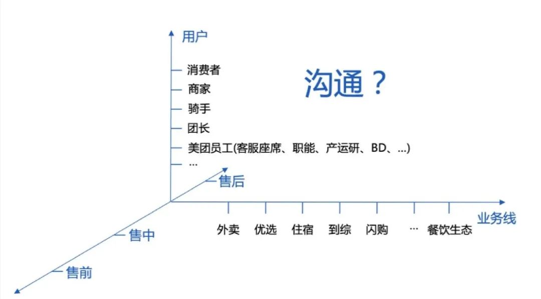 比如美团,交易用户量巨大,身份复杂,涵盖消费者、商家、骑手、团长、员工等;平台又涉及到吃、住、行、游、购、娱等200多个生活服务品类;在平台服务的售前、售中、售后各个环节,都有大量信息咨询、订单状态获取以及申诉投诉等沟通诉求。如果这些沟通都通过人力来实现问询互动,成本大而效率低。因此,美团将用户、业务线和时间线划分为三大维度,建立交互立方图,利用智能客服技术,面对不同场景、不同人群、不同业务线,提供问题推荐、问题理解、对话管理、答案供给、话术推荐和会话摘要等核心服务,以提高互动效率。