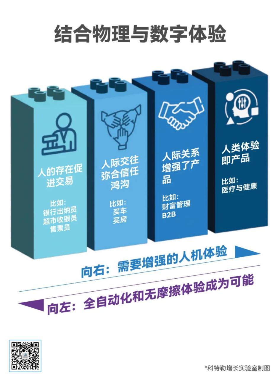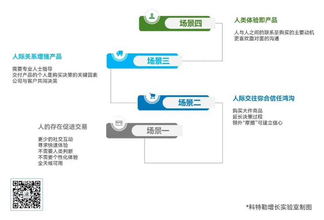 在频谱的一端(场景1),人类的接触是最不重要的,这使得完全自动化和无摩擦的体验成为可能。在另一端(场景4),人的触摸是最重要的,使增强的人机体验成为最好的方法。