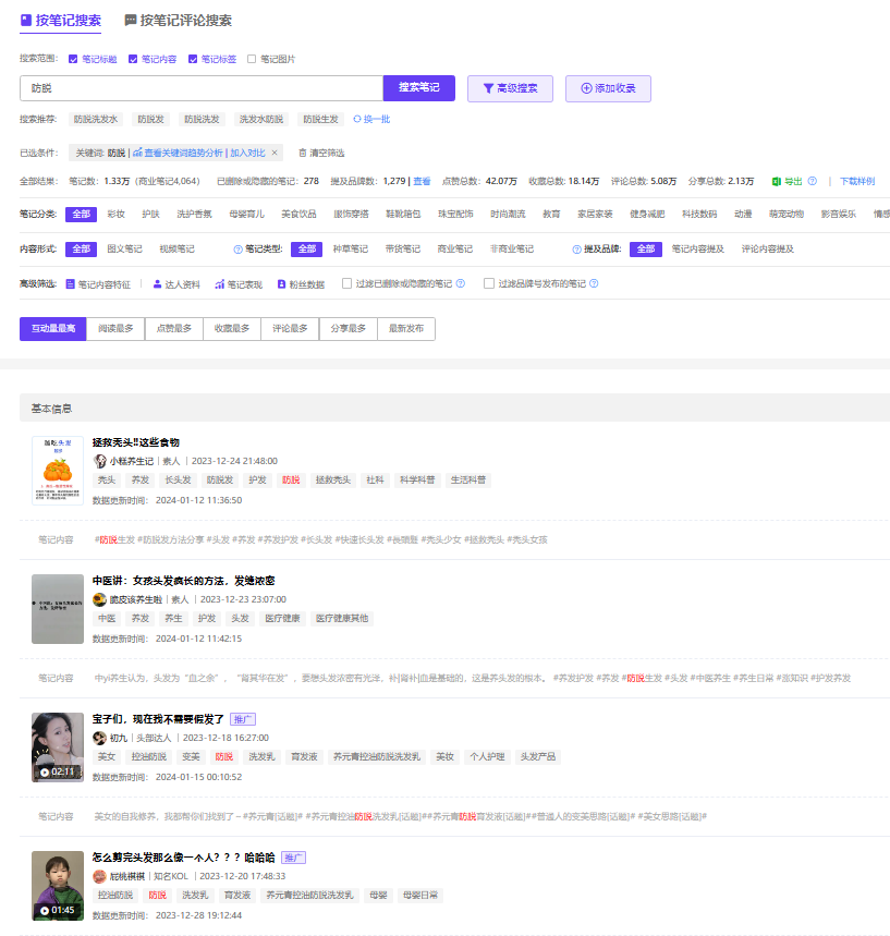 如果说,你觉得蒲公英提供的笔记数量太少,还可以通过小红书第三方数据平台拉取相关笔记,按照互动量排序导出,可以非常高效的了解到类目中已有哪些用户关注度比较高的选题