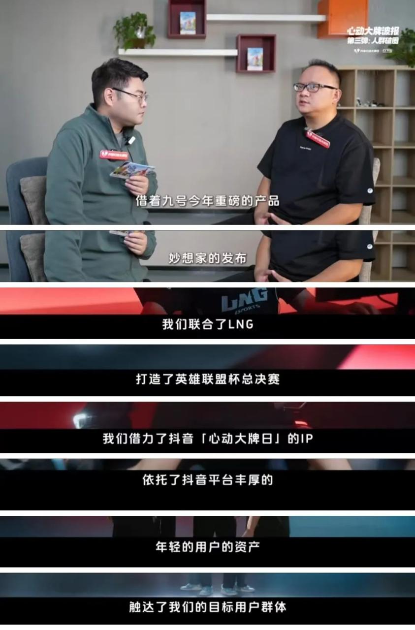 为了深入年轻人圈层,九号电动车选择电竞营销作为切入点。今年5月,九号发布年度重磅新品“妙想家”,借着新品发布九号联合LNG打造了英雄联盟杯总决赛。正值618阶段,九号携手抖音心动大牌日以“无畏出发,奇妙自现”为主题开启活动,借助平台丰富的年轻人群资产,延续自建赛事和发布会热度,和年轻用户基于兴趣展开近距离沟通。基于抖音心动大牌日的声量放大效果,九号电动车在活动期间达成9800万GMV、全网曝光量超5亿。