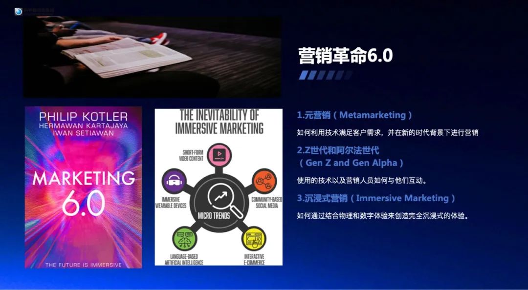 此外,还有营销革命6.0。在 AIGC 时代,元宇宙、沉浸式媒体、线上线下融合、公域私域全方位覆盖,实现对顾客的 360 度沉浸式包围,将体验作为顾客价值选择的核心驱动力,使 Metamarketing (全域营销)成为现实,即融合媒体、嵌入顾客链路的整合营销。