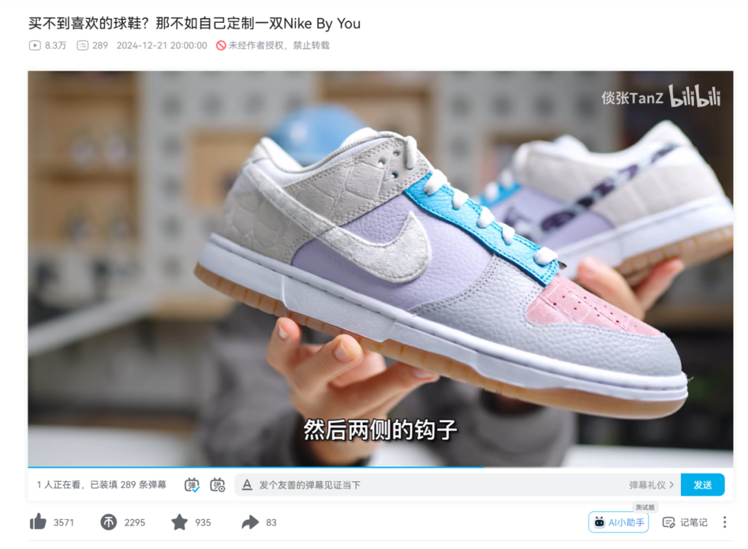 而在稍早的双旦期间,NIKE NBY又在BILIBILI上做了一波推广。9位UP主,基于他们各自的独特视角和审美,在耐克平台上定制个人鞋款,通过视频向广大B站用户展示了整个定制过程和产品细节,并深度阐述了NIKE NBY的故事。