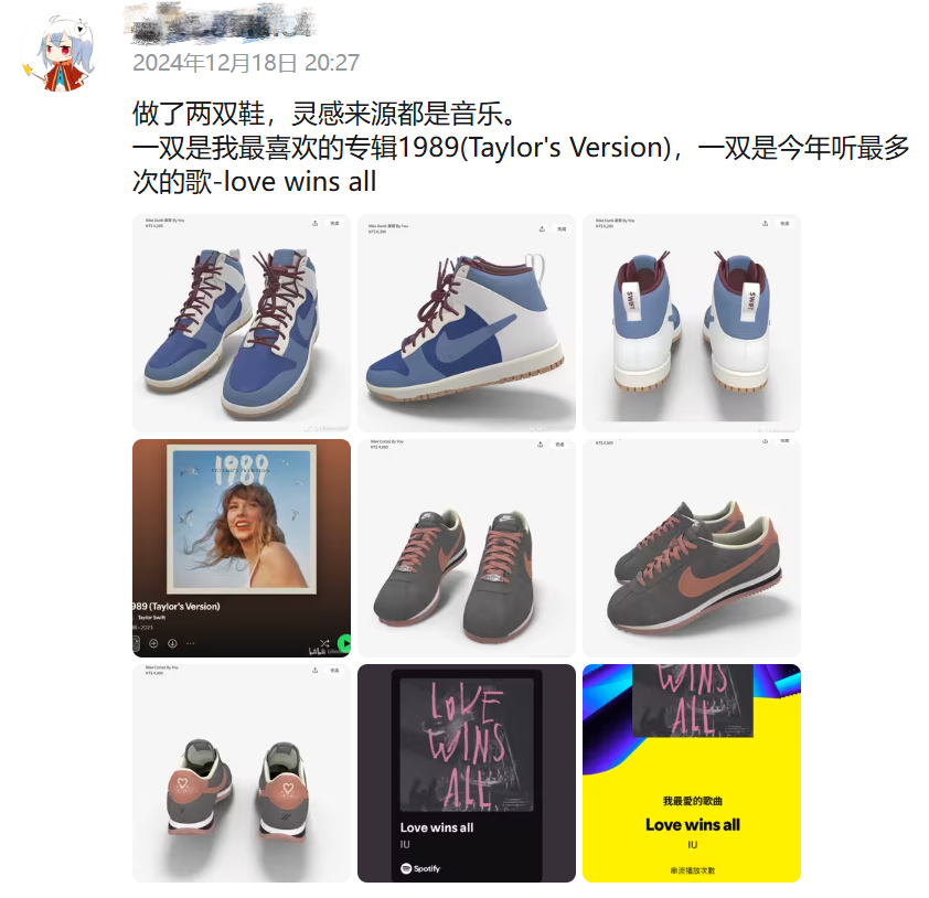 在UP评论区,有大量用户晒出自己设计的NIKE NBY鞋款,比如我看到有人借鉴自己最钟意的相机型号来设计鞋款,有人将影响自己至深的音乐专辑封面定制到鞋上,有人晒出自己曾经定制的鞋款,和家人、恋人、兄弟共同定制的鞋款等,分享自己的故事……