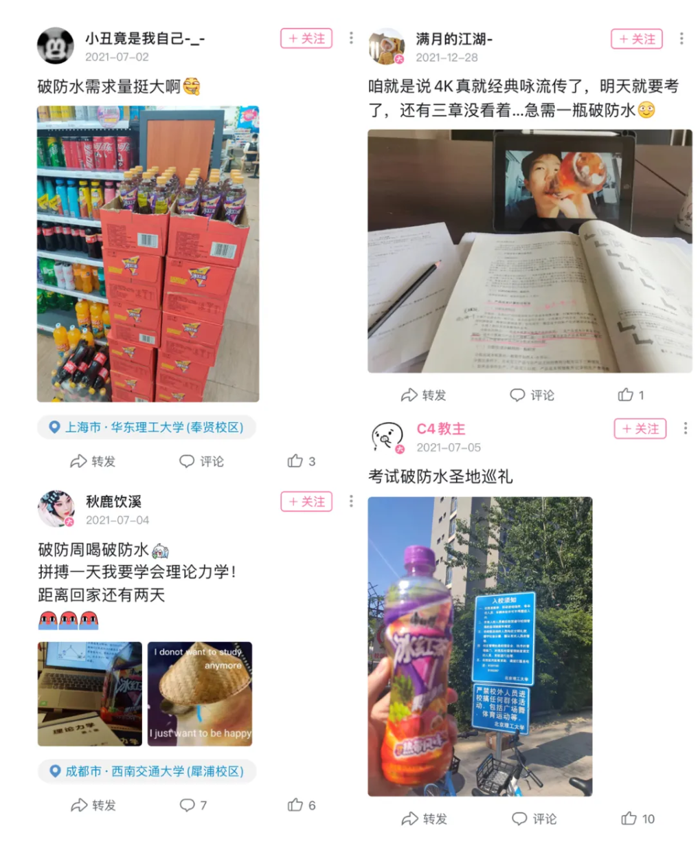 精准吐槽和全程金句迅速击中了大学生群体,就连视频中出现的康师傅冰红茶热带风味,也被弹幕戏称为考试周限定饮品——“破防水”,被众多大学生当作复习必备饮料,迅速在各大高校便利店卖到断货。